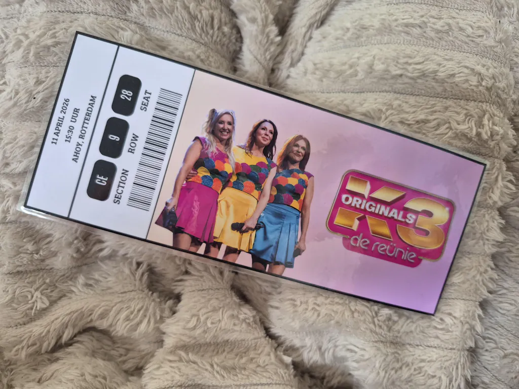 Ga terug in de tijd en beleef de magie van K3 met dit kleurrijke cadeauticket voor de K3 Reünie! Dit full color ticket is de perfecte verrassing voor elke K3-fan of voor jezelf als mooi aandenken aan dit bijzondere moment.
